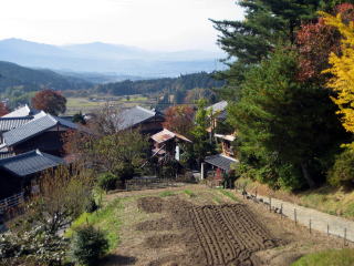 ▲馬籠宿の陣馬付近。右の小径が中山道。街道を取り巻く環境は山野や農村が圧倒的で、そのなかで宿駅だけがいくらか都市集落的な場面だった。