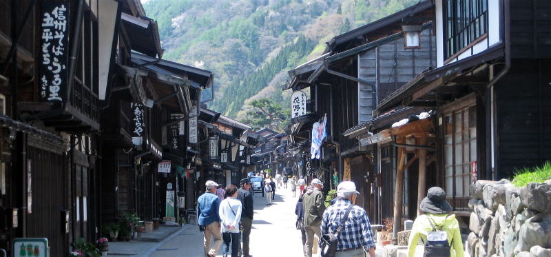 奈良井宿の下町 右端の石垣は桝形の一部分 : 塩尻・贄川方面からの宿駅への入り口はここだった。