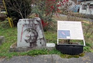 接待碑の少し先には、蚯蚓神のモニュンメントと説明板があります。街道の西側の山裾に蚯蚓神社(今では四阿だけ)があったのだそうです。土壌の肥沃さを生み出すミミズや一切の生き物を敬い大切にするエコロジックな信仰ですね。