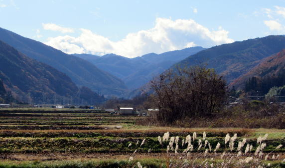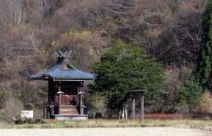 このバス停の東に広がる水田地帯のなかに、まだ新しい端正な社殿がポツンと立っています。国道142号を走っていてその社殿を見かけて気になったので、長和の里歴史館で尋ねたところ、大年神社だとわかりました。