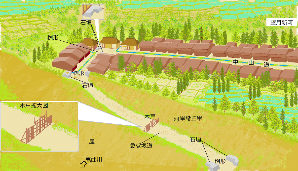 上の絵図は、望月新町の中山道の鉤の手道に設けられていた桝形跡の地形から、往時の姿を復元した想像図です。