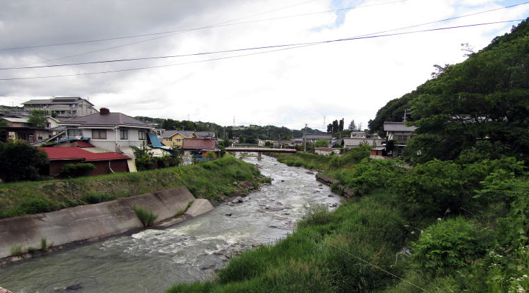 長坂橋の手前で後方を振り返ってみると、新町の家並みは段丘崖の上に見えます。つまり、これだけの高低差がある道筋を歩いてきたわけです。