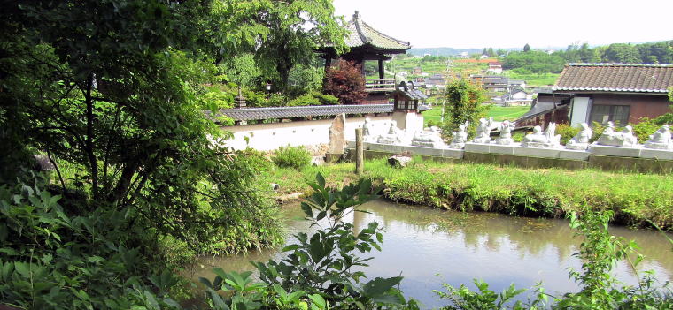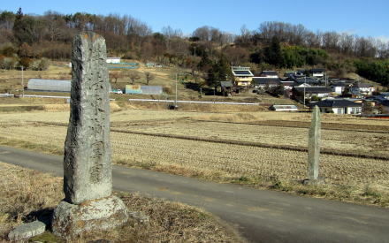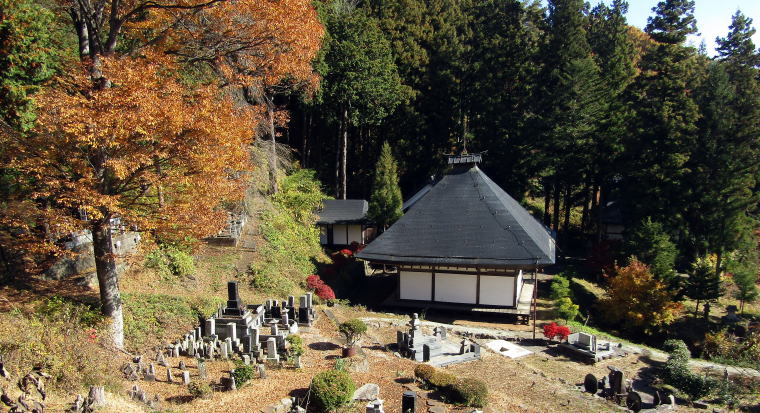 背後の丘には、あちらこちらと家門ごとに一塊の墓地が散在しています。中世まで曲輪壇(家臣団屋敷)があったところに、江戸時代になってから家系ごとに墓標を建てていったのではないでしょうか。寺域の西端にも、家門ごとの墓地がさまざまに異なった向きで散在しています。これは、氏神を祀る以前の風習の名残りかもしれません。