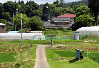 高台の境内(塀脇)から山門の南の小平集落を見渡す