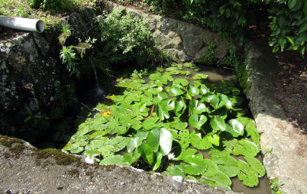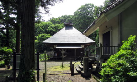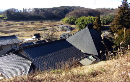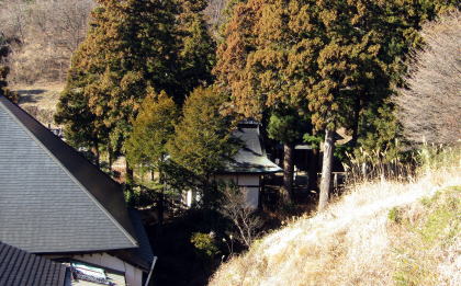 私は境内の背後(北側)に迫る丘を歩き回って観察してみました。本堂や庫裏・客殿の背後に迫る丘からの眺めは、領主館から丘陵尾根下の小平の集落と田園を統治すべく睥睨するという様態でした。ここには、はじめから寺があったというよりも、まず豪族の領主館があって、その跡地に寺が移されて立地したのではないかという印象です。⇒次頁参照