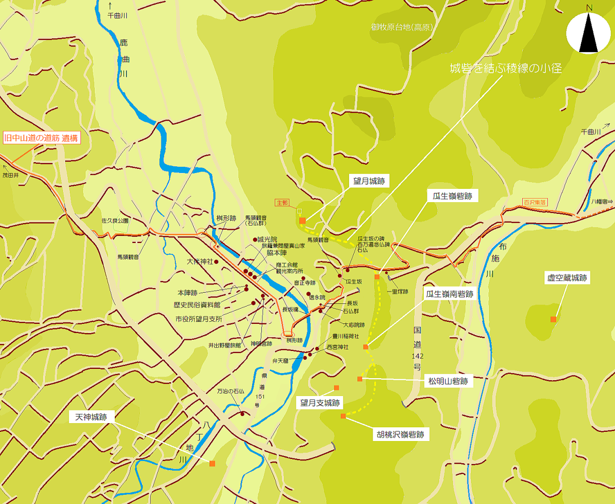 下の絵地図は、旧中山道望月宿を中心とする地理を示すもので、ここでは望月城砦群跡の配置を見るように描いてあります。ただし、虚空蔵城跡は布施川に隔てられた別の勢力圏に属すると見られます。