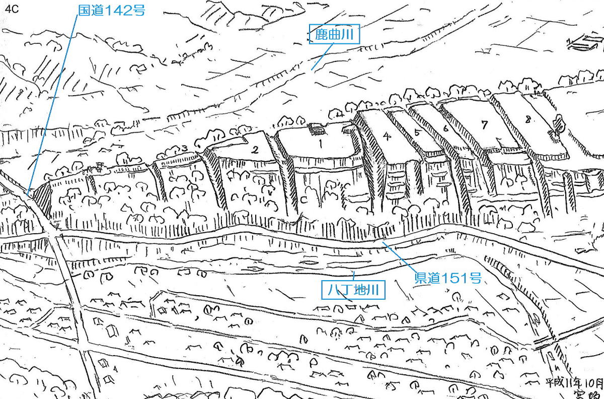 望月氏が大和王権直轄の馬牧場の牧監職にあった頃(平安〜鎌倉時代)には、その居館(官衙)は御牧原台地の上にあったと思われます。城下町と集落・水田などの農地はその高原台地上にあったようです。ところが、室町時代になる頃から、望月氏は台地の南西側の鹿曲川流域に集落と農耕地を開いていったものと考えられます。とはいえその時代、望月宿となるはずの地帯では、鹿曲川は流水量と水勢が普段から大きく、頻繁に増水し破壊力はすさまじく、集落と農耕地を開くことはできないほど危険だったようです。