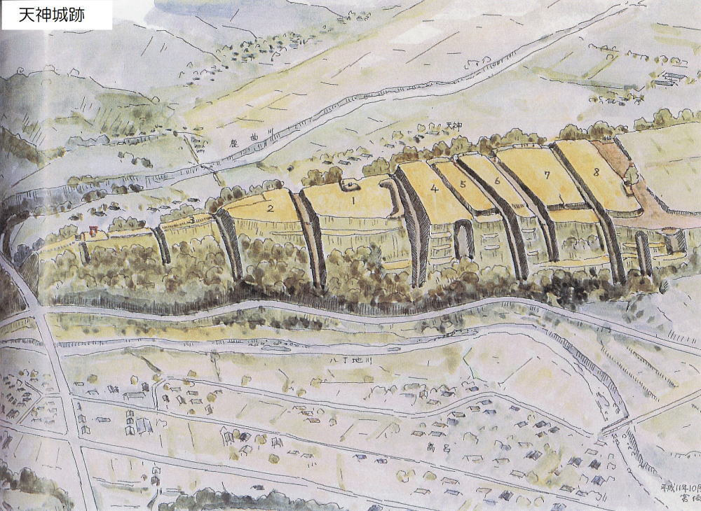 【天神城の鳥観図】 出典:宮坂武男『縄張図・断面図・鳥観図で見る 信濃の屋代と館』(2012年刊、p274)