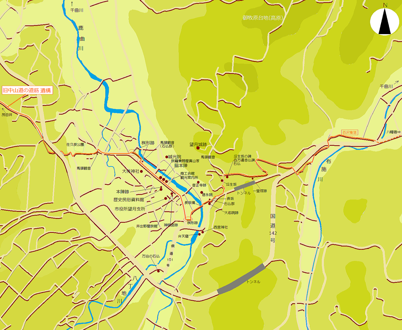 茂田井から東に向かう中山道は、丘陵を越えて鹿曲川の谷間に入って望月宿に到達します。そこから街道は、御牧原台地の南西端の尾根(瓜生峠)を越えて東に向かい、布瀬川の峡谷に降りて百沢集落を経て八幡宿にいたります。街道はそこからさらに東に向かって千曲川をめざして進みます。千曲川の西岸をめざす、下り坂の道筋です