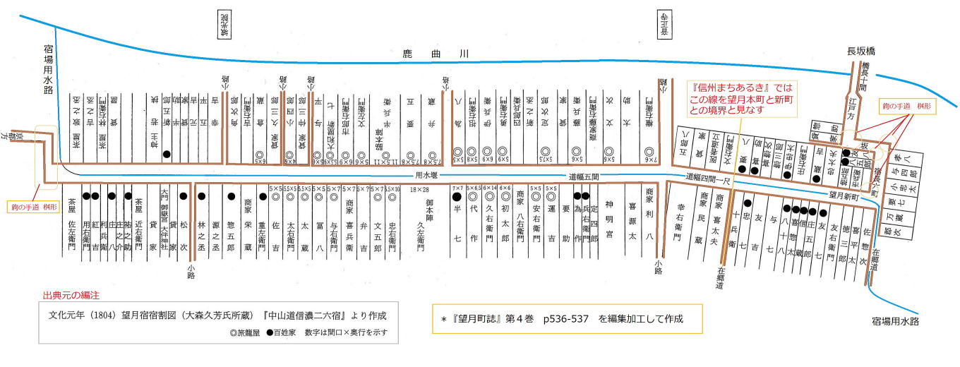 上の絵図は、江戸時代の望月宿の宿場の形と町割りを描いたものです。『望月町誌』第4巻 536−537ページの町割り図をもとに編集加工して作成しました。
