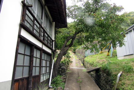▲急な斜面につくられた段々畑や棚田跡