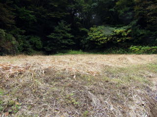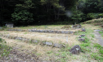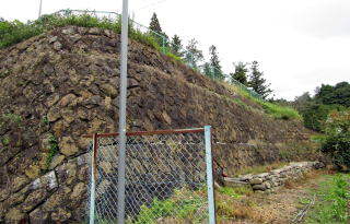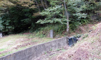 現在、鹿曲川の右岸の差一番高い河岸段丘から続く急斜面をなすこの一帯は、棚田跡や段々畑が続いています。耕作地や草地の段差は、ほとんどが――土や草で覆われていても――石垣で支えられています。なかにはすこぶる大がかりな石垣も多く、城砦の郭壇にも似た大寺院の跡ではないかと想像できます。。
