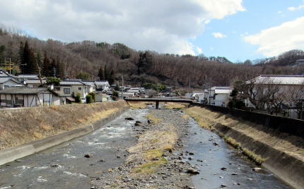 鹿曲川の右岸をめぐり、旧望月新町跡、音正寺跡、大応院跡を訪ね、遠い昔の姿を思い浮べます。1742年の大洪水の前には、望月新町は鹿曲川の右岸にありました。集落の入り口から――右折して街通りに入らないで――まっすぐ東方の山裾に向かうと、音正寺という寺院があったそうです。