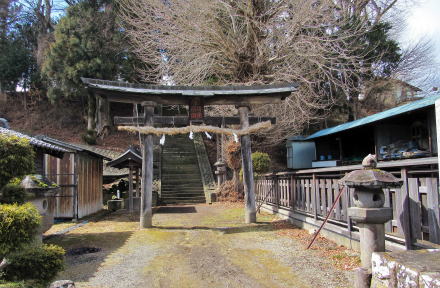 大伴神社から70メートルほど先に県道166号が旧街道に合流するT字路がありますが、その30メートル手前、街道左傍らの家並みのあいだに小路があります。小路越しに、望月城主の菩提寺だった城光院という禅宗寺院が見えます。