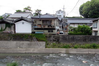 往時参道だった小路を川の対岸から眺める。自動車がある小路が往時の参道跡。その下の河岸に橋があったという。