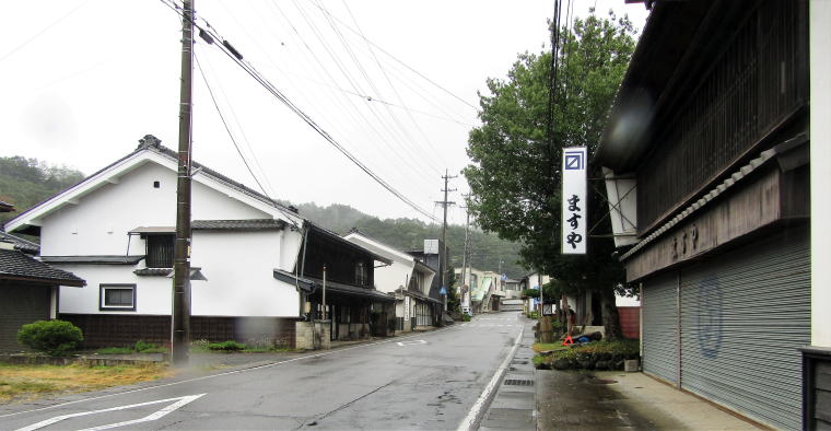 旧街道を南東に歩き始めてすぐに右手に重厚な町家造りの店舗跡が見えてきます。「ますや(舛屋)」という屋号で、看板サインやシャッターのディスプレイから昭和期には寝具・洋品店だったことがわかります。