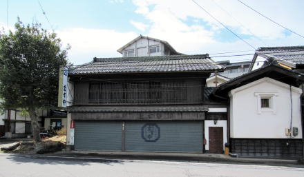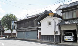 間口が狭く奥行きが深い町家造りの基本構造を残しながら、屋根を瓦葺きにし、商売のために一階を道側に広げたと見られます。店舗棟の脇には重厚な漆喰白壁土蔵が、妻面を道側に向けて建っています。