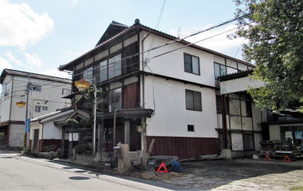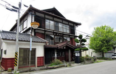舛屋から一軒おいたところに井出野屋旅館があります。そこの古老に聞いたところ、大正期に旅館業を始めたそうです。大正レトロな建築様式で、外観どおり三階建てです。映画『犬神家の一族』で旅館セットのモデルとなったそうです。映画セットは井出野屋とそっくりにつくられたのだとか。