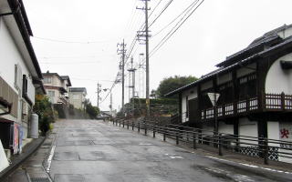 神明宮跡を過ぎた辺りから旧街道の上り坂の勾配が気になってきます。勾配は伊勢屋食堂の前に来ると、かなり目立ってきます。ここで旧街道は大きく右に曲がります。伊勢屋の南に小路がありますが、この小路は江戸時代からあった小径で、伊勢屋の背後で南に曲がりながら段丘崖を斜めにのぼっていったようです。
