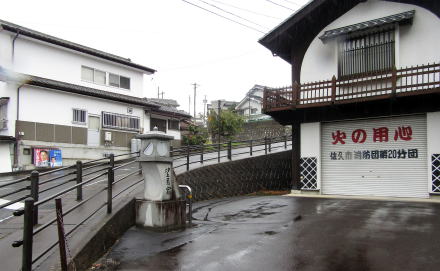 井出野屋の少し南には佐久消防団第20分団の基地がありますが、ここは往時、神明宮の参道と境内がありました。その頃、その南の坂道――佐久市役所望月支所前の道路――はなく、神明宮の境内だったのです。境内の奥は、もともと河岸段丘崖だったのですが、道路建設にさいして土を盛って坂にしました。