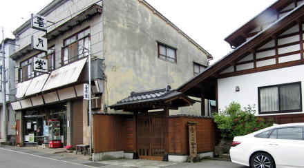 大和屋呉服店の隣は、おそらくはかつて旅館を営んでいたかと思えるほどに、広壮な建物です。というのも、玄関の上が入母屋破風となっているからです。玄関脇に「薬用人参製造販売」という表示があるので、かつて薬種問屋または薬剤店だったのかもしれません。