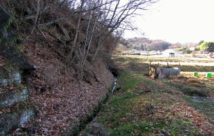 左掲の写真は、城跡の下の谷間の水田地帯の端、尾根下を流れる倉見沢の様子です。冬の渇水期なので、水量はごくわずかです。
