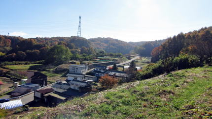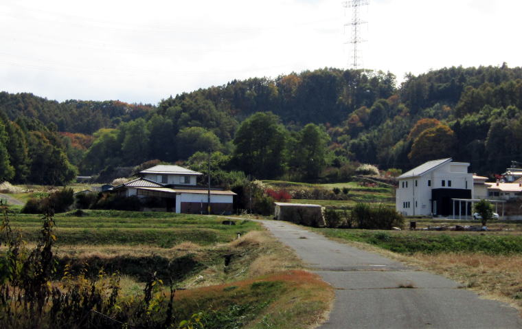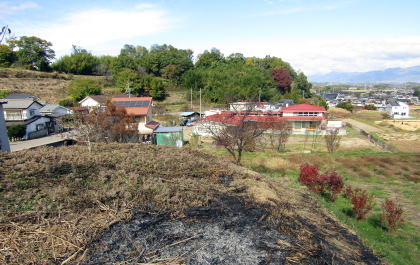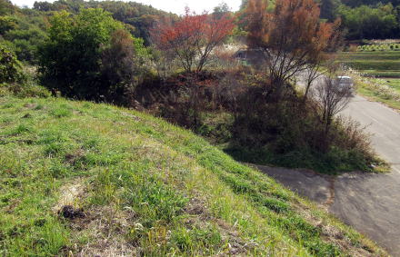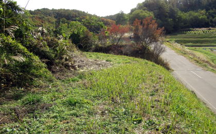 倉見城跡がある小高い丘は、茂田井集落に向かって南から北に張り出した2筋の尾根のあいだにあって谷間を見おろす位置にあります。2筋の尾根のうち西側の尾根の裾(中腹)の裾から盛り上がった小さな丘の先端にあるのです。