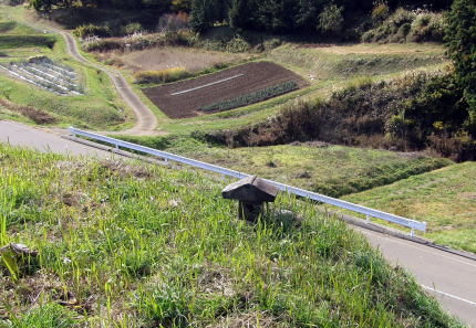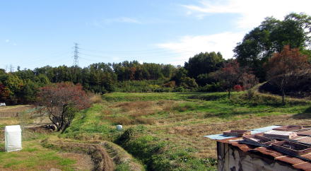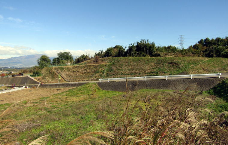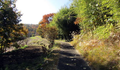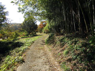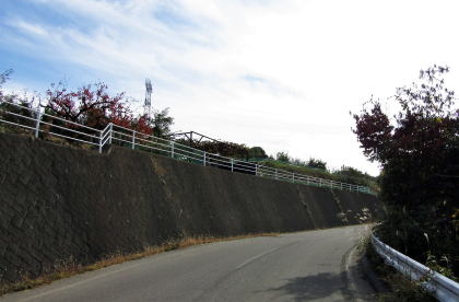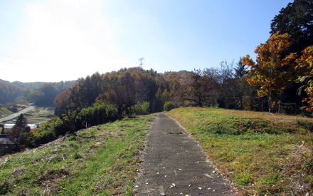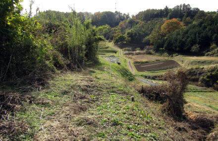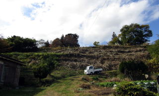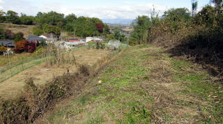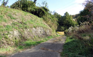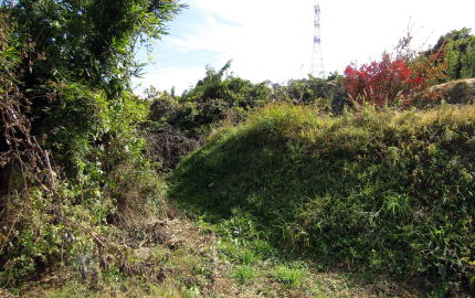 ![]() ▲右端が城跡遺構の北端で、そこから上に城郭跡があるという ![]() ▲曲輪跡(段郭)は今は畑となっている ![]() ▲堀切跡や段差がいたるところに見られる丘の上の畑作地 ![]() ▲段丘の中央部はすっかり藪に覆われている ![]() ▲切通しの段丘崖の上にある小さな石祠。下の道は降小路に向かう。 ![]() ▲道路建設のために斜面を切通したため、崖はさらに急になっている ![]() ▲この曲輪は、南端の切通しによって背後の尾根筋と切断されている ![]() ▲城跡の下の尾根裾を流れる倉見沢の小さな流れ |