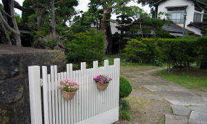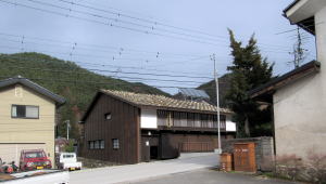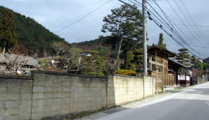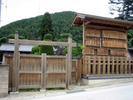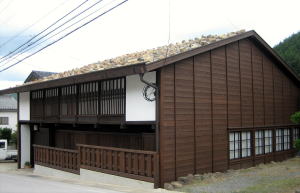 この家屋は、完全に江戸時代の「街道宿駅の町屋造り」に修復されているようです。妻側の壁はすべて板張りで、街道に面したところだけが漆喰白壁になっています。さらに、屋根は杉皮葺きで大きな石を重しに乗せてあります。