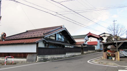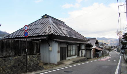 さて、私の街並み観察の印象を記すと、街道に面して妻面を向けている本棟造りの古民家は、江戸時代または明治前期から続く商家だったのではないかと見られます。旧街道沿いに1軒だけ今でも営業している漬物店(マルモ岡谷)は、本棟造りの店舗です。漬物屋という和風の伝統産業だから、現在でも命脈を保っているのでしょう。