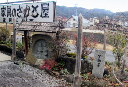 ![]() ▲3基の石塔(天神社・蠱玉神社・道祖神)が草地の西端に並ぶ ![]() ▲背後からのの眺め ![]() ▲街道を挟んで向かいの東端に立つ双体道祖神と中山道標柱 |