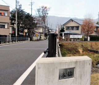 横河川を渡る直前の旧中山道の南脇に神社の境内があります。100平方メートルほどの台形の草地で、神社であることを示すのは3基並んでいる石塔です。草地の南端には「蠱玉神社」の標柱があるので、いまでは神社の跡(史跡)となっているようです。