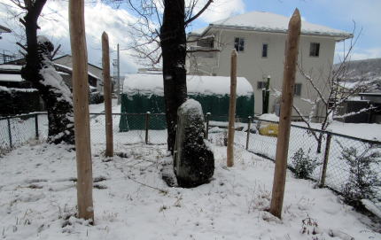 ![]() ▲草地の中ほどに立つ天神社の石塔。傍らにはムクノキ。 ![]() ▲四隅に御柱が立ち、石の神を取り囲んでいる ![]() |