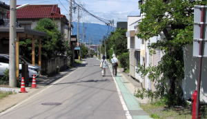 現在、今井歯科医院がある辻で東に入り、堀内家住宅の手前を通り、塩尻東小学校の脇を抜け、阿禮神社の手前でやや南に折れ曲がります。そして「鍵の手」でおよそ120°の角度で左折します。