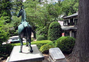 観音堂の前には馬の銅像が立っています。見るからに小ぶりなうえに足の短い身体形状で、木曾馬だとわかります。木曾義仲の愛馬「鬼葦毛」でしょう。