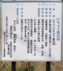 説明板には、1860年に築堤され、貯水量はおよそ4000立方メートル、一町歩の田を灌漑したとあります。そうすると、池の深さは1メートルないし1.3メートルくらいだったのでしょう。