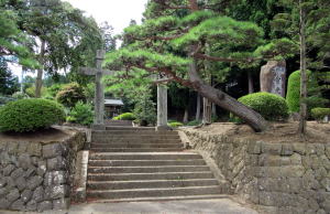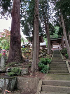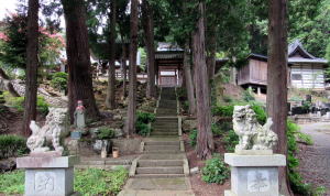 山麓の道沿いに境内に上る石段と門柱がある