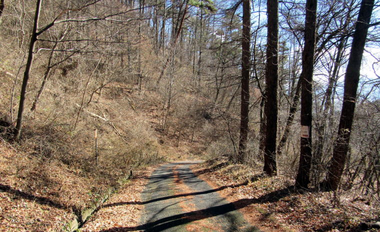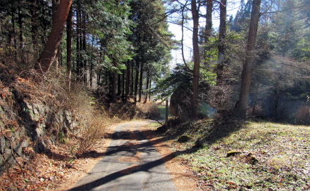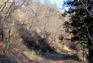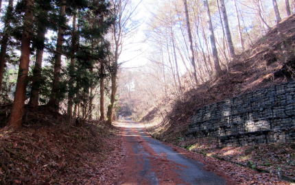 この谷を挟む両尾根を覆う樹林はだいたいが落葉広葉樹で、ところどころに杉などの針葉樹やアカマツの群落があります。落葉樹が中心なので、陽射しが葉を落とした樹々を通り抜けて山肌を照らしていて、初冬ですが明るく開放的な景観です。昭和中期からこの辺りでは、杉植林の波をかぶらなかったので自然林が残っています。しかし、道を下っていくにしたがって杉林の割合が増えていきます。
