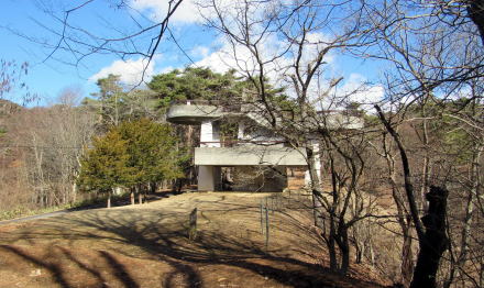初冬の碑を浴びる谷間に杉が木陰をつくる