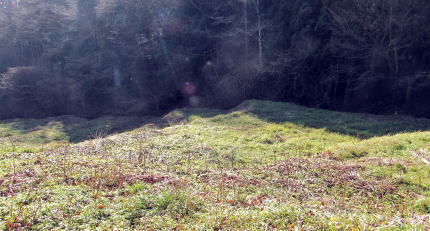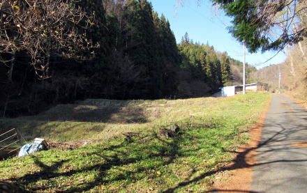 谷底を往く道が600メートルほど続いたところで谷底の横幅が広がります。街道は沢筋から少し離れて谷底の北端を往くようになります。街道と沢との間には、棚田の跡が残っています。棚田跡は幅10メートルほどの階段状の地形です。