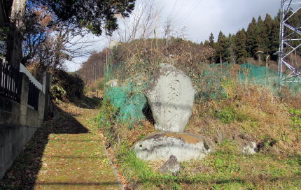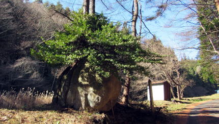 今あるのは、耕作が放棄されてから20年以上経過したと見られる段々テラスの草地です。そんな草地の端を往く街道の右脇(南側)に大岩があります。大岩といっても高さが2メートルほどの大きな石です。
