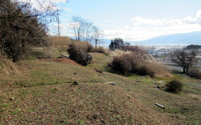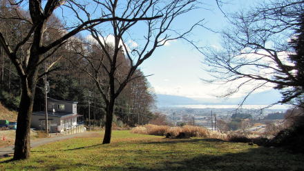 さて、この辺りで標高は850メートルくらいで、峠の頂部から標高にして100メートルほど下ってきたことになります。谷間の底に横たわる平坦地が広がってきたので、街道を外れて棚田の跡の草地に入ると、場所によっては谷間の彼方に諏訪湖が眺められるようになりました。昭和期に棚田を開墾・耕作した人びとは、農作業の合い間に谷間に見える諏訪湖や湖畔の風景を愛でていたのかもしれません。