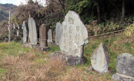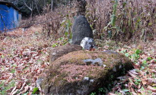 大岩から道を東に200メートルあまり進むと、道の左脇(北側)に尾根中腹の高台にのぼっていく階段道があります。これは石船観音の境内に向かう参道です。言い伝えでは、境内が整備されたのは明治時代のはじめの頃だとか。急斜面の境内(岩棚)には水神社、馬頭観音など多くの石祠・石仏群が祀られています。ここには別の機会にあらためて探訪することにします。