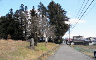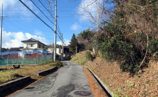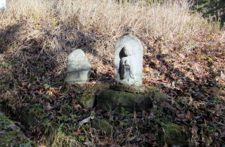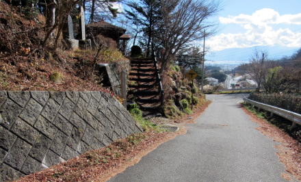 張り出した尾根丘からこの市道に下ってくる畦道のような細道の脇に石仏2体が並んでいます。その坂の下に不動尊碑が立っています。細道は旧中山道の脇道で、村人が塩尻峠に行き来したり農作業のために頻繁に通った道だったようです。