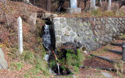 境内から道路脇の用水側溝に境内から小さな滝のように水が流れ落ちています。その水源が山腹斜面にあって鳴沢の清水と呼ばれているようです。