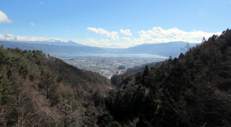 谷間の彼方に見える諏訪湖は神々しく見えます。湖畔に諏訪大社を谷間の平坦斜面の幅が広がるということは、そこから扇状地形が広がる起点だということです。ここまで街道が寄り添ってきた沢は、諏訪湖に注ぐ塚間川の源流だったのです。諏訪湖の北西岸をなす岡谷は、この塚間川の扇状地と横河川の扇状地とが合わさった複合扇状地をなしています。