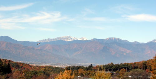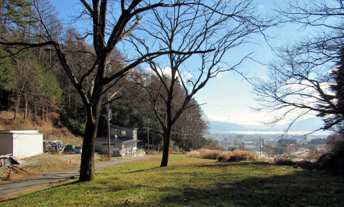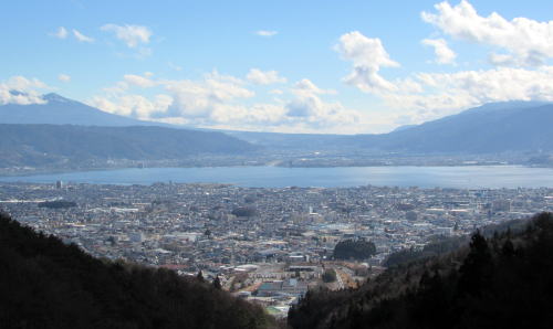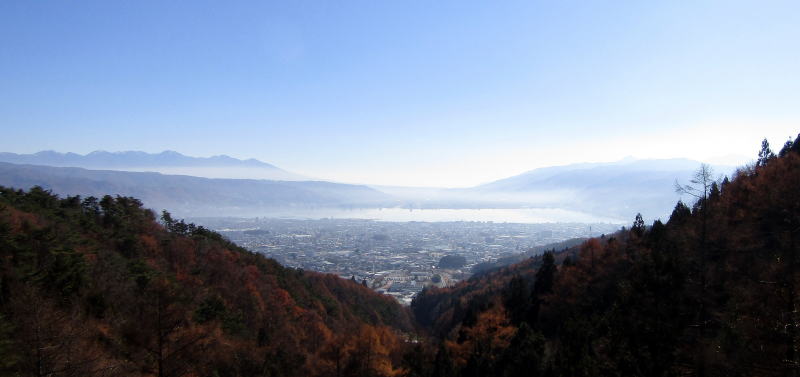 写真は、塩尻峠の最高地点にある塩嶺御野立公園の展望台から諏訪湖を展望した風景です。谷間からは岡谷市と下諏訪町の市街、左奥(東側)には八ケ岳連峰、右奥(南側)には守屋山系や入笠高原を眺めることができます。