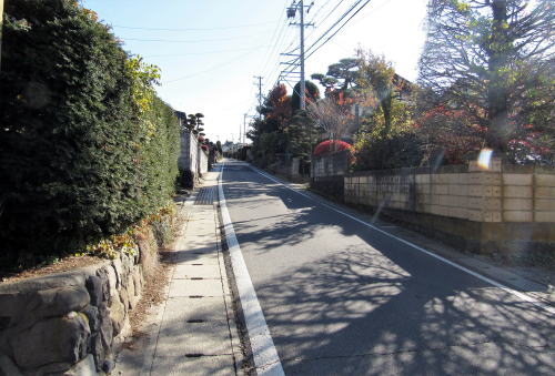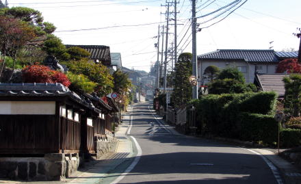 この道を歩き続けるのは楽ではありませんが、視界のなかで緩やかに曲がりながら先に向かって上昇していく沿道景観は、立体的で奥行き感があります。しかも、美しい前庭をともなう家並みの敷地が階段状に連なっているのです。あのカーブの先の風景はどうなっているのか、楽しみな街道歩きになります。