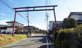 そんな自然発生的な村道と街道とが出会う辻に双体道祖神があります。集落の中ほどのこの辻は、八幡神社への参道が街道から北に分岐するところです。参道は左右に湾曲しながら北東に向かい、200メートルほど進んだ地点で八幡神社の大鳥居前にいたり、そのまま丸山丘の裾を往き、丘の東端に沿って東から南に回り込みます。