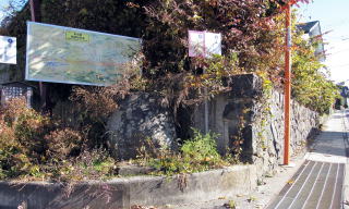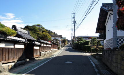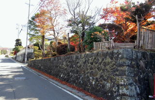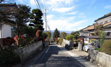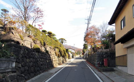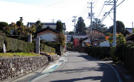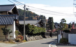 集落の東の端に街道を挟んで2、3軒の住戸があります。両側の敷地ともに高い石垣で大きな段差を支えています。ここは、いわば谷間になっています。江戸時代には小丘があったのを明治以降に切通して、街道を滑らかな坂道にして、両側に屋敷地を造成したものと見られます。